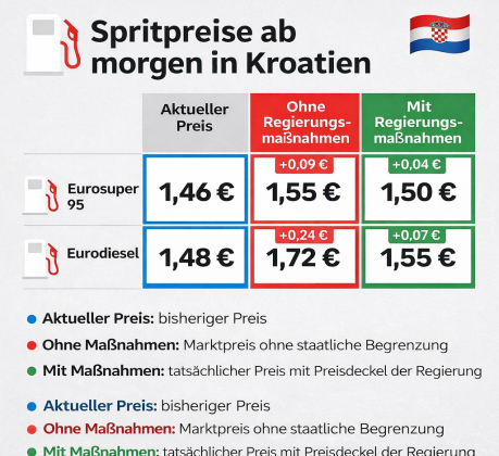 Die kroatische Regierung hat am Montag auf ihrer Sitzung Obergrenzen für Benzin- und Dieselpreise beschlossen. Die neuen Höchstpreise gelten mit...