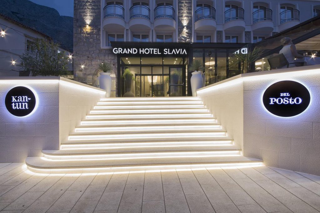 Das Grand Hotel Slavia ist ein kürzlich renoviertes Hotel im Zentrum von Baska Voda und wird das ganze Jahr über betrieben. Es ist auch ein zentraler Ort für die Organisation von Geschäftstreffen und verschiedenen Veranstaltungen in Baska Voda. Es verfügt über 72 Wohneinheiten, ein geräumiges Wellnesscenter und ein spezielles Beautycenter. Das À-la-carte-Restaurant Del Posto ist als eines der besten Gourmetrestaurants an der Makarska Riviera bekannt.