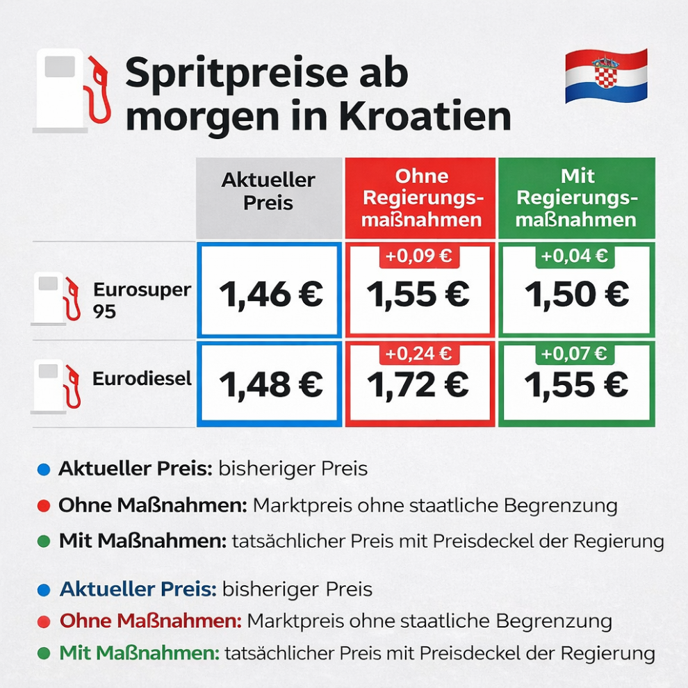 Die kroatische Regierung hat am Montag auf ihrer Sitzung Obergrenzen für Benzin- und Dieselpreise beschlossen. Die neuen Höchstpreise gelten mit sofortiger Wirkung für alle Tankstellen im Land.