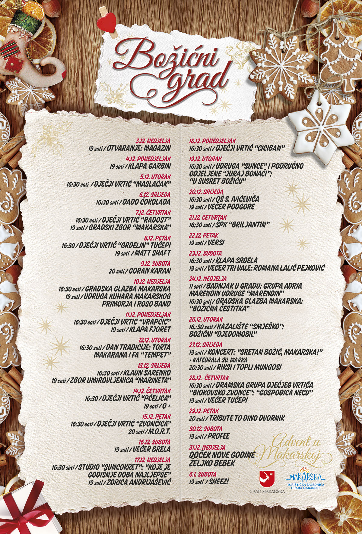 Ein volles Programm, darunter bekannte Musikkünstler wie die MORT Gruppe, Goran Karan sowie die Rocklegende Željko Bebek der in der Silvesternacht die Makaraner ins neue Jahr begleiten wird, sowie 14 Weihnachtshäschen werden die Besucher sicherlich erfreuen.